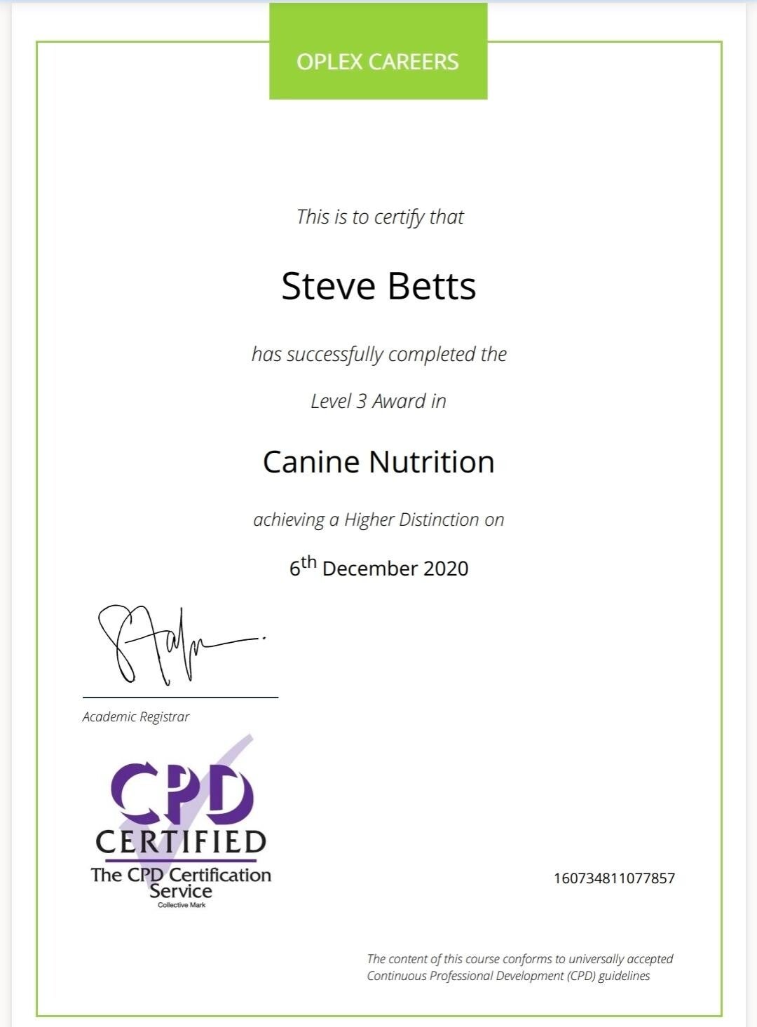 Having managed a successful Raw Dog Food business for several years, I took the opportunity to learn and understand more, during my reduced working hours in the Covid Lock Down, and studied Canine Nutrition. Although I then took a step back from working with dogs I have continued to study and learn so that I can better understand a dog's needs!